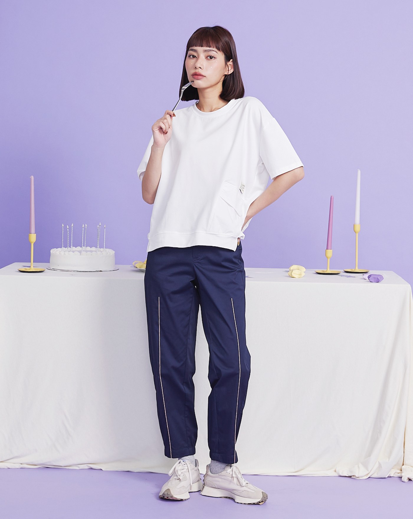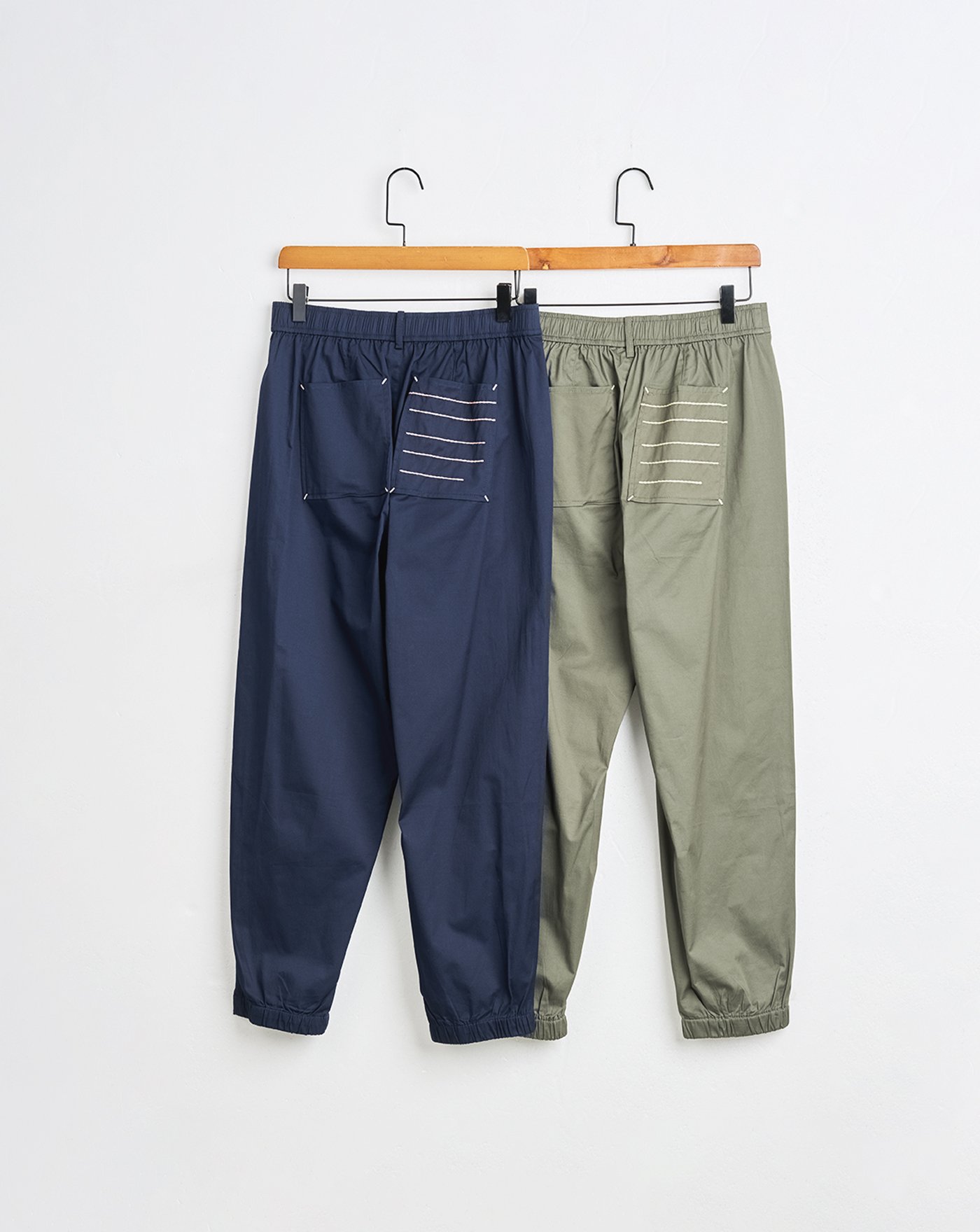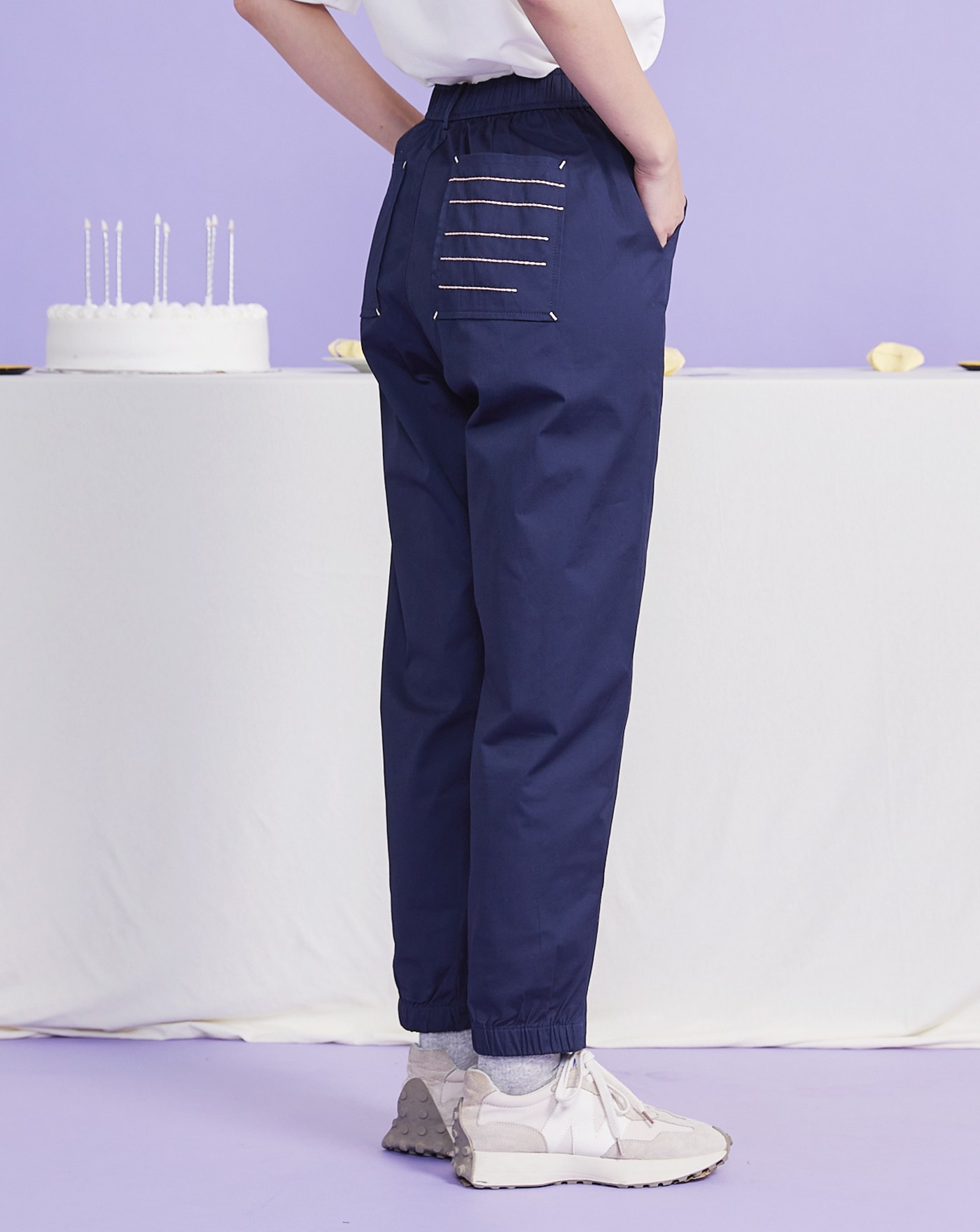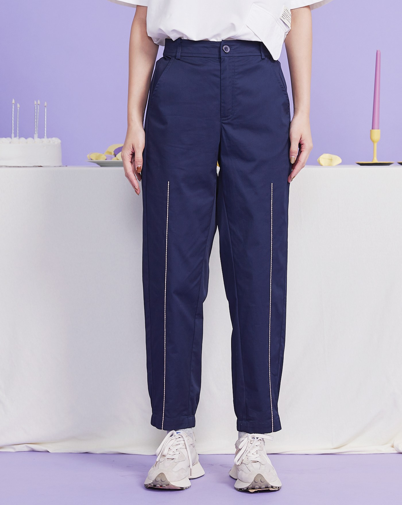 配色跳針壓線裝飾後腰鬆緊帶修身版型彈力斜紋棉
