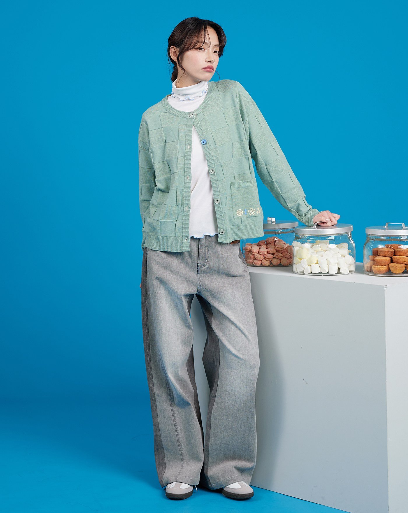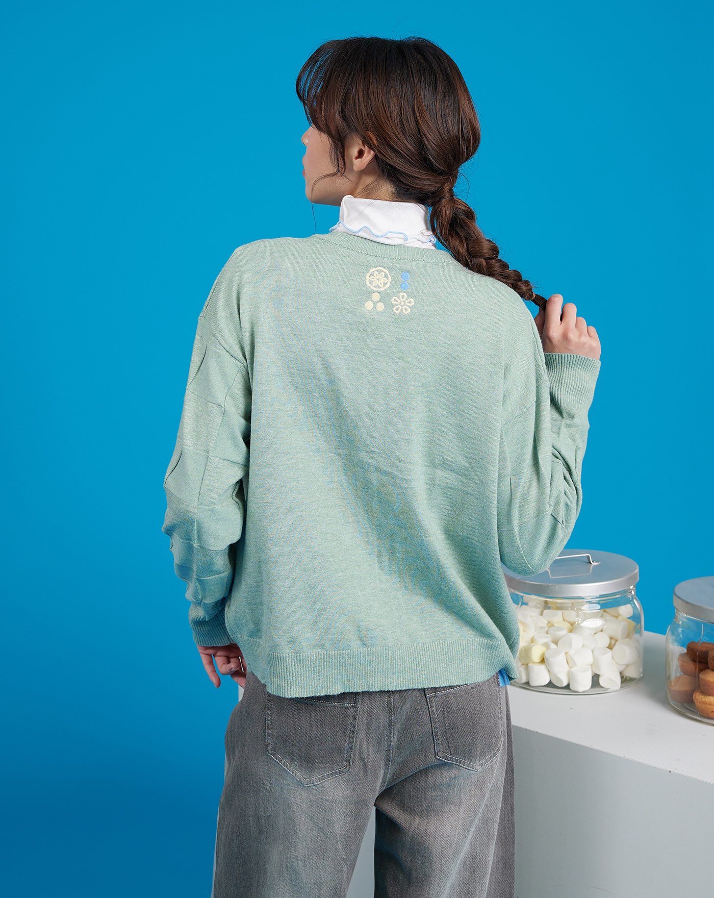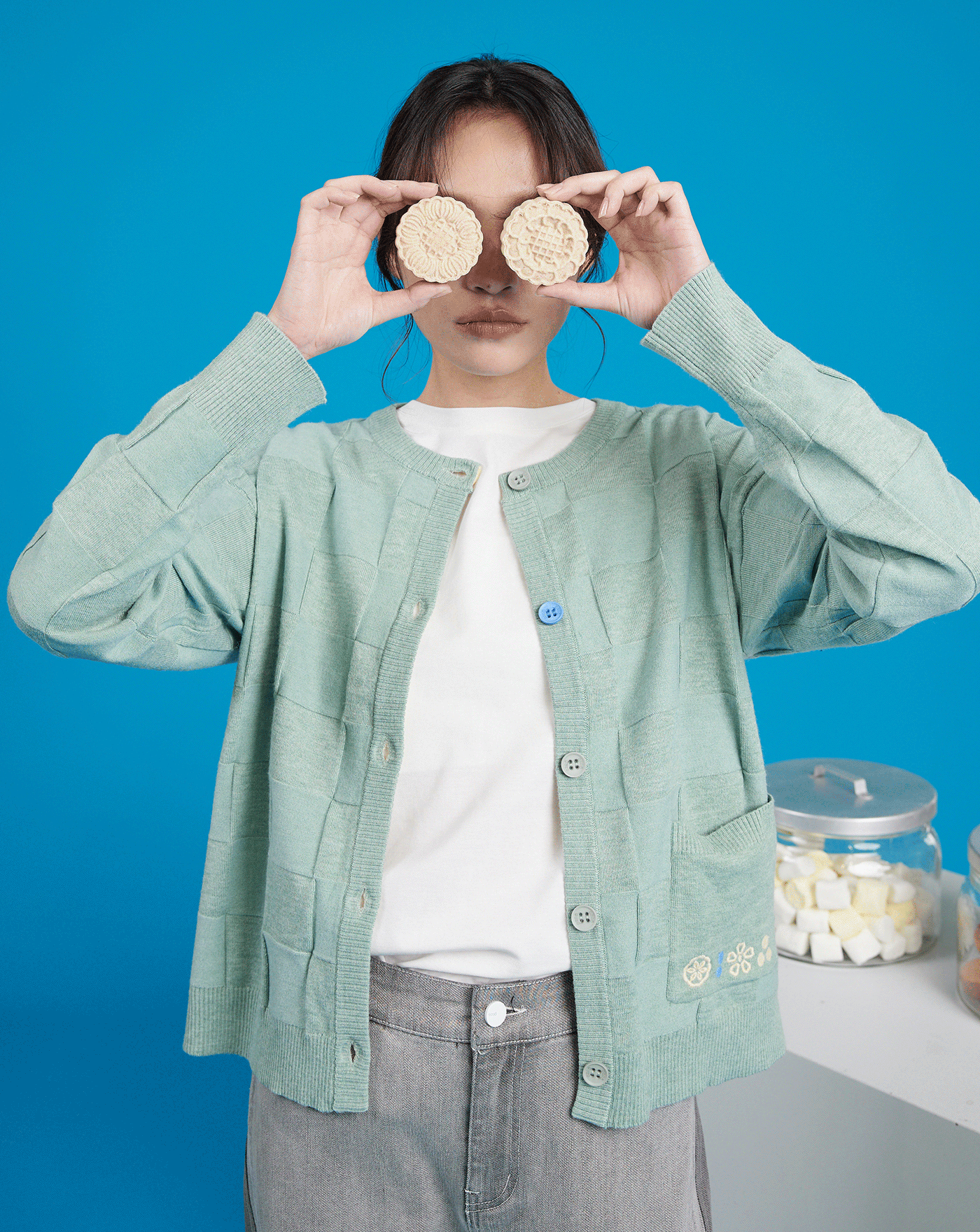 棋盤格毛衣外套微落肩修身小版型領口/扣子配色口袋圖案:糕餅阿嬤的摩斯密碼(綠豆椪的小紅點點)親膚澳絨毛/柔軟親膚面感,細紗薄款不厚重