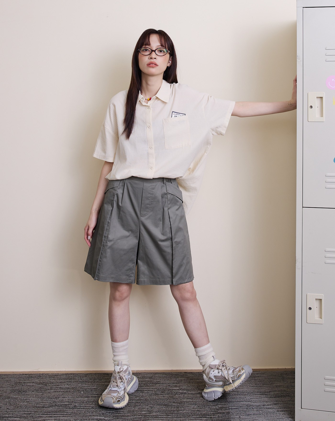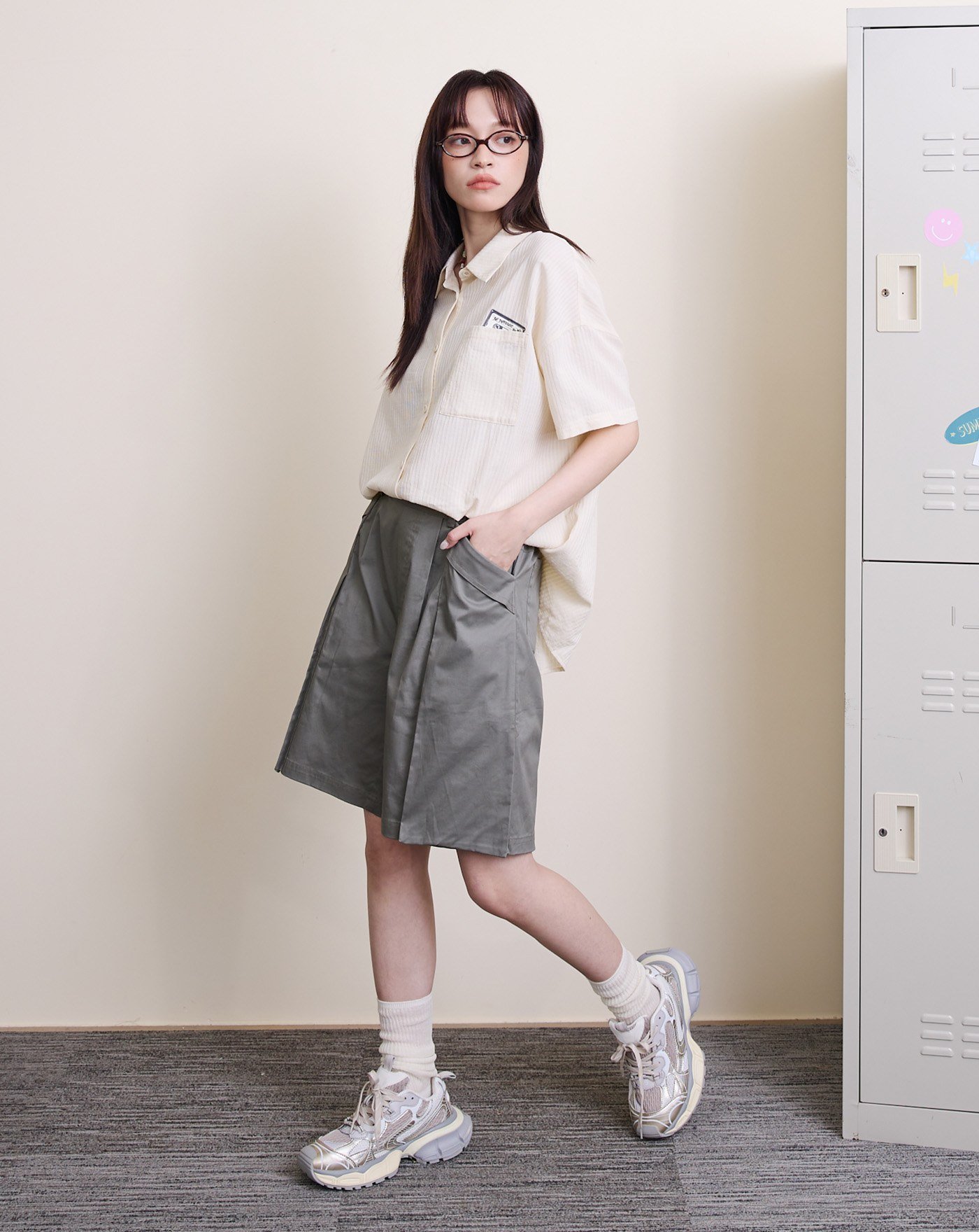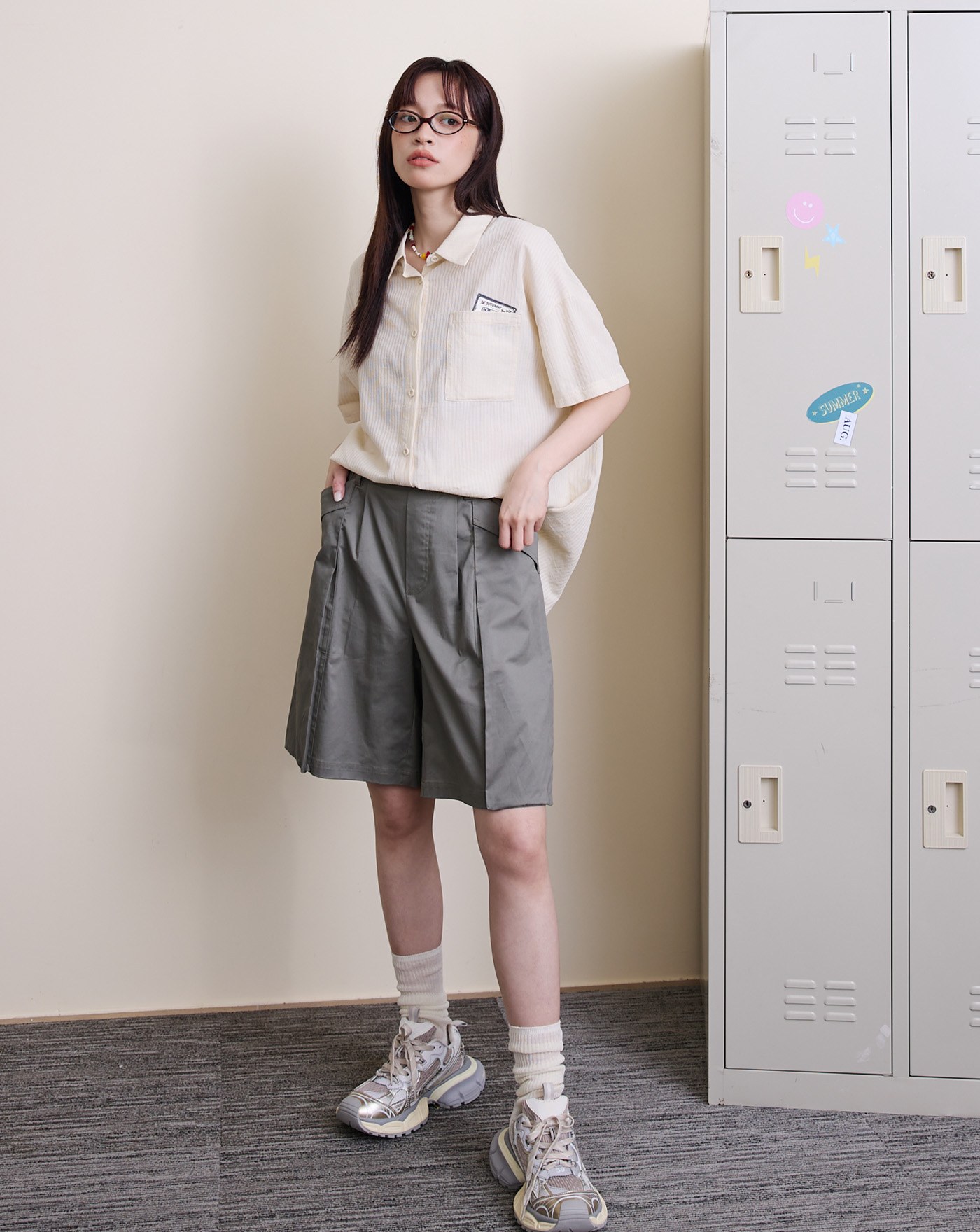 復古趣味設計不對稱下擺條紋短袖襯衫(兩色)