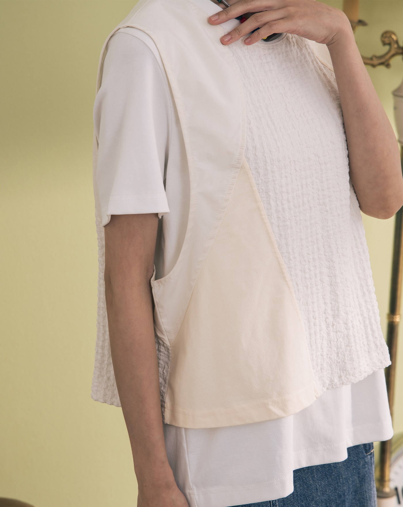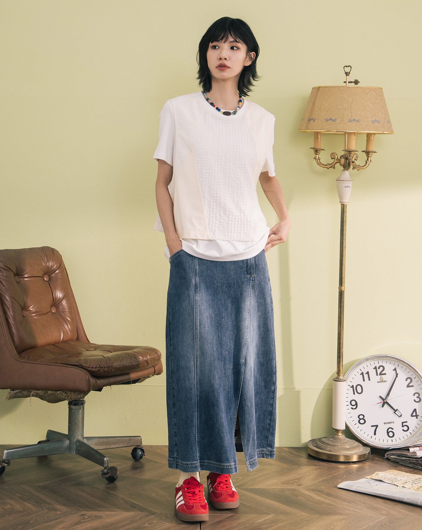 A|顯瘦刷色不對稱腰頭兩件式牛仔褲(兩色)