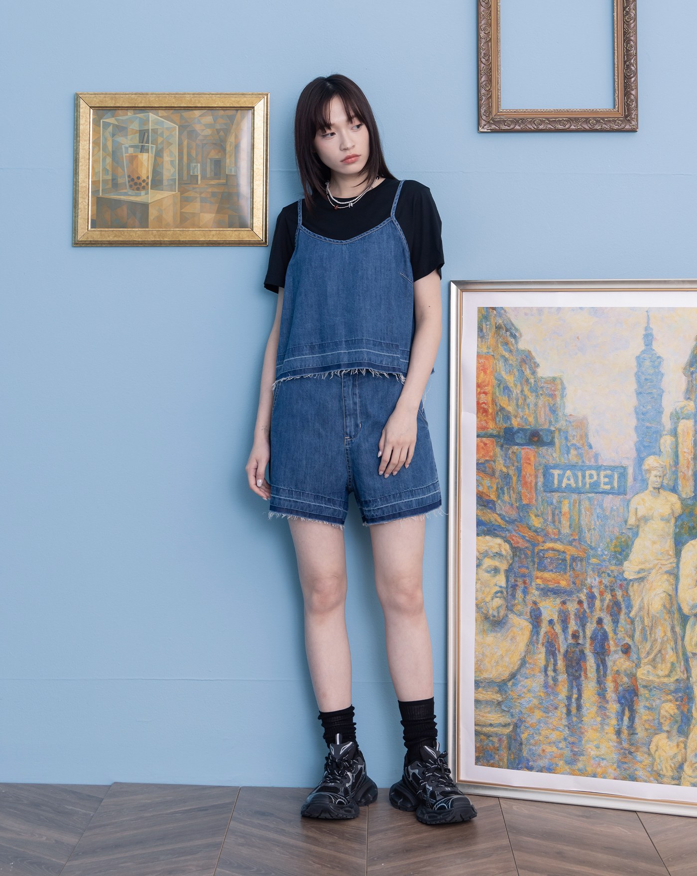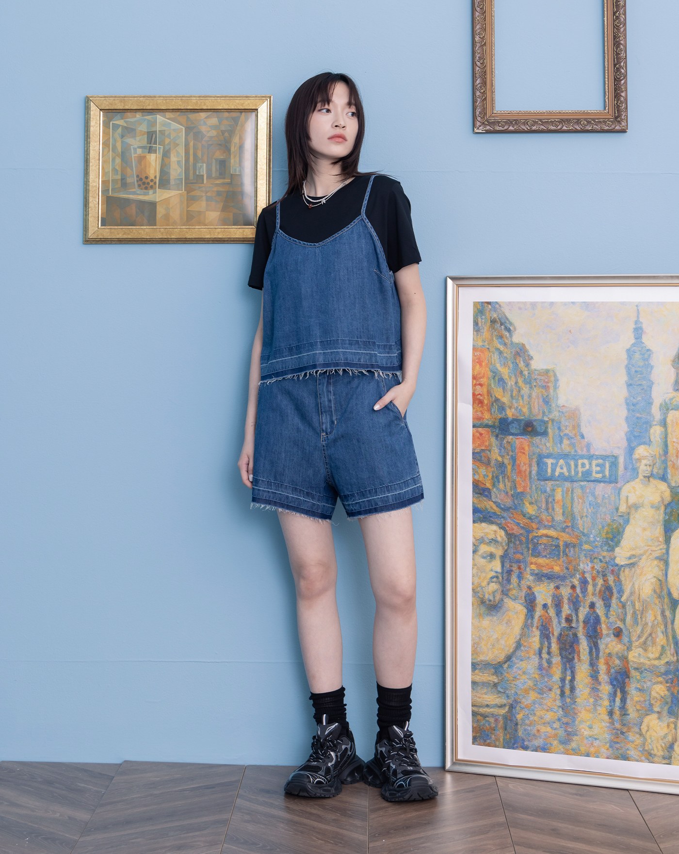 彈性牛仔不走光工裝短褲裙(兩色)