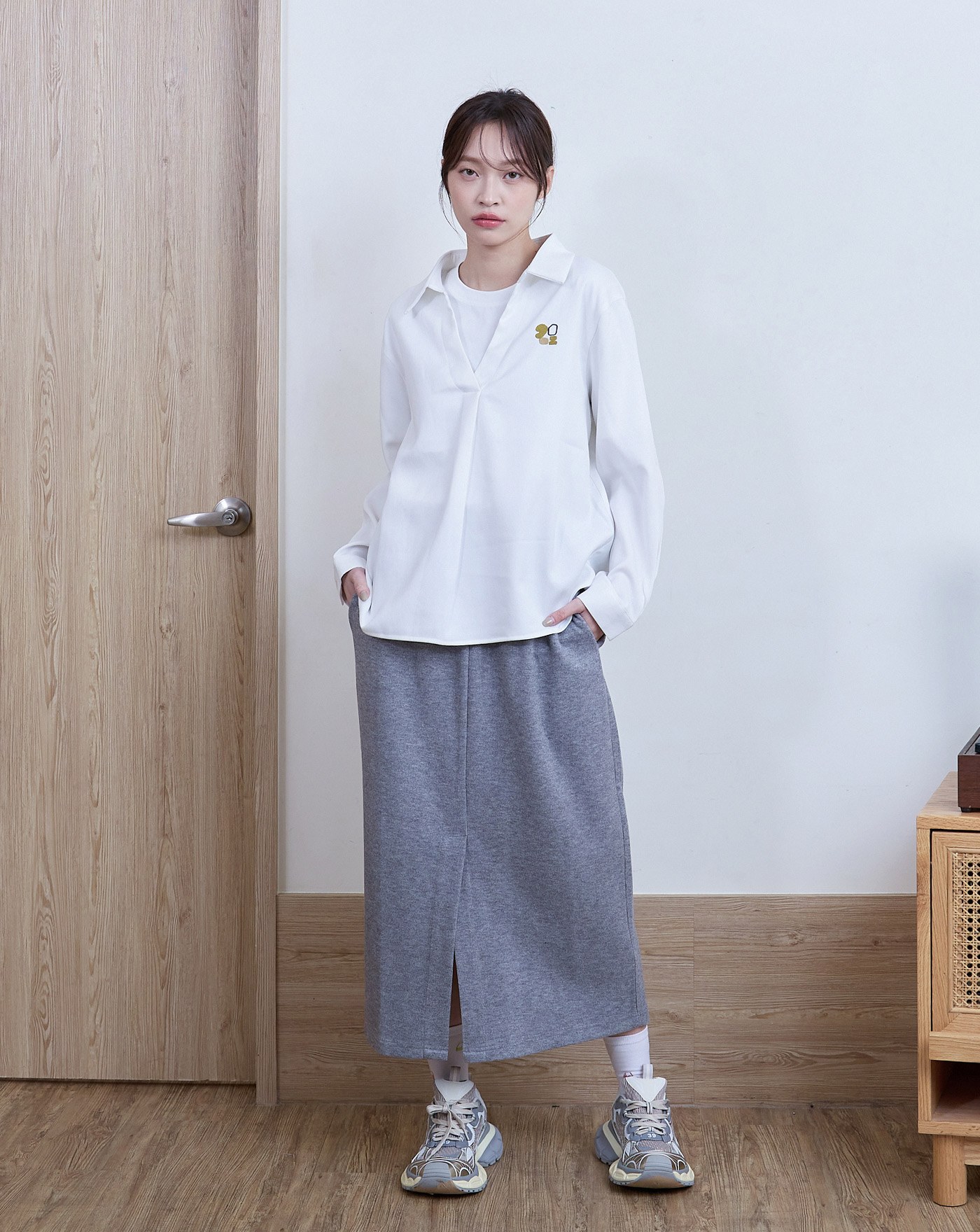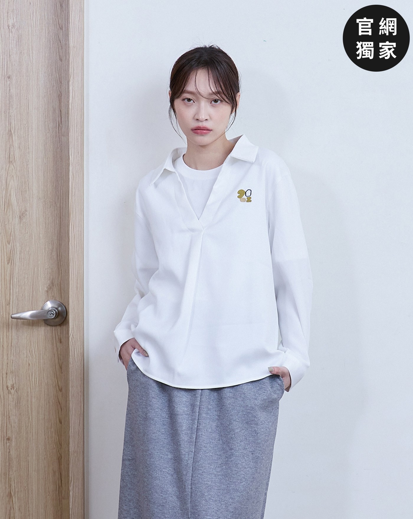 g字繡花落肩彈力牛仔襯衫(兩色)