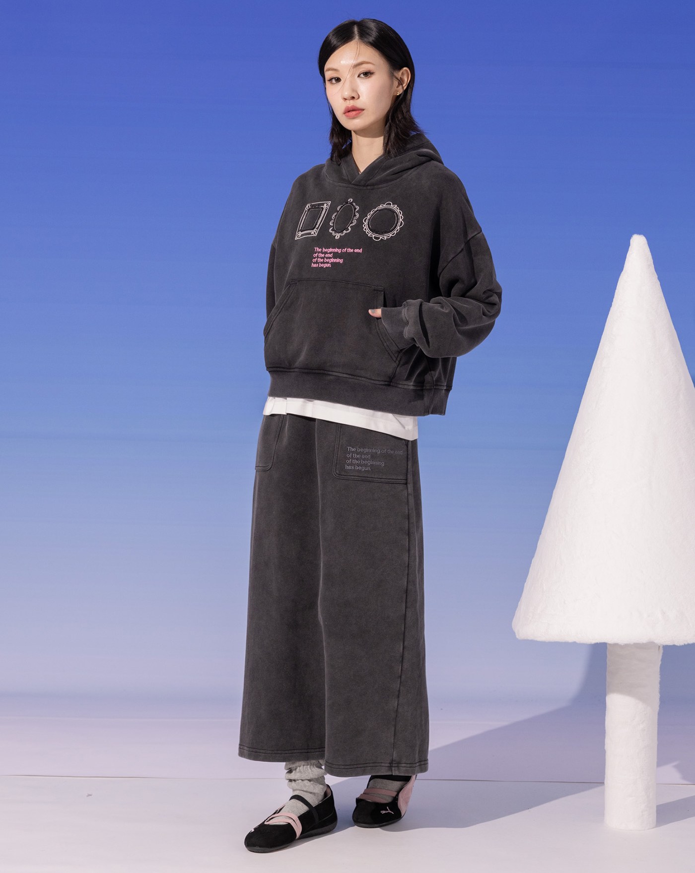 鏡面繡花水洗牛仔口袋帽T