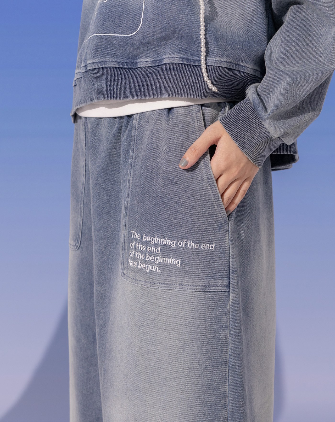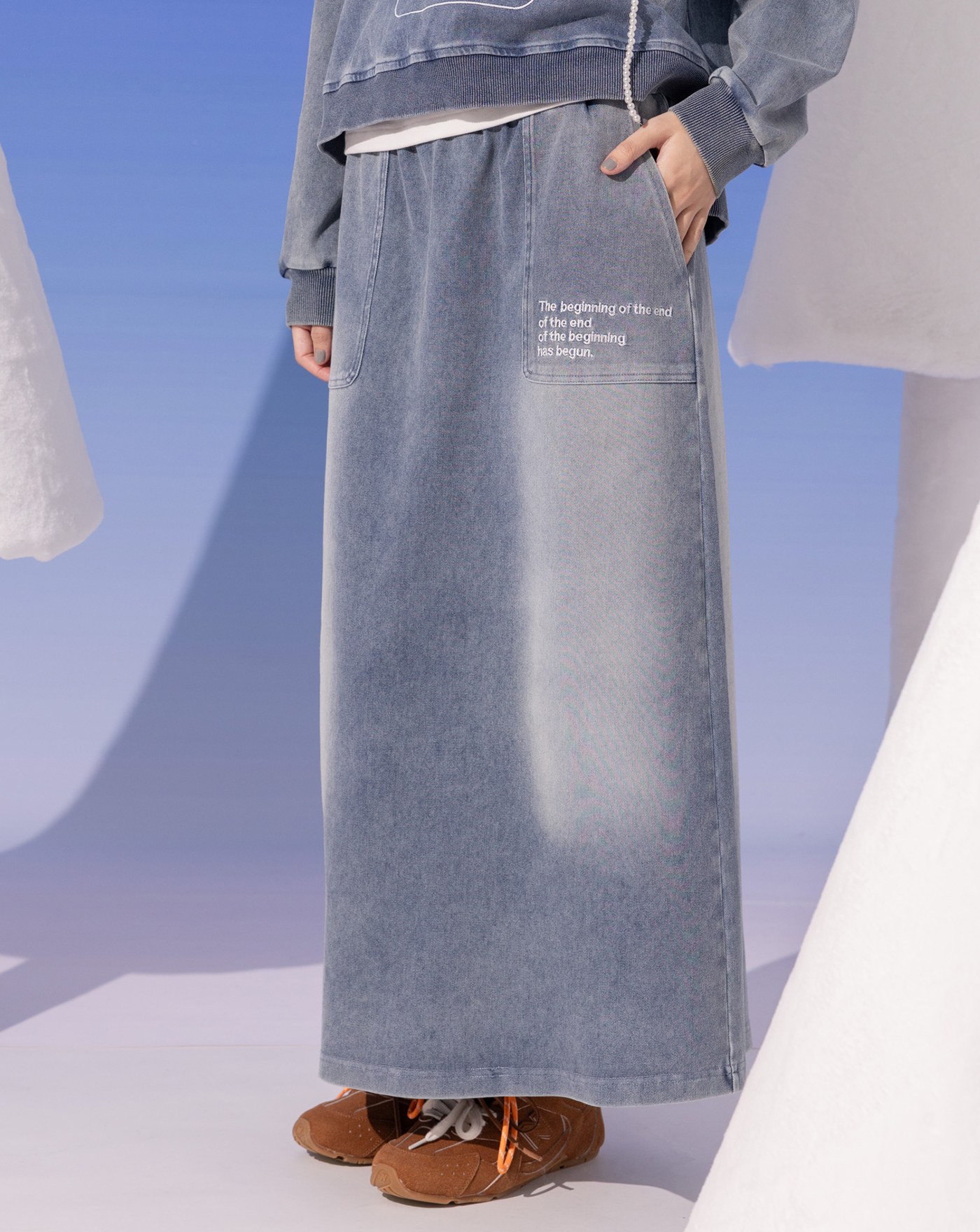 洗舊感口袋造型標語繡花純棉長裙