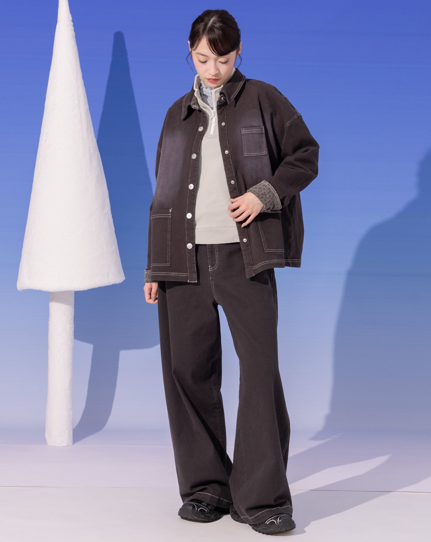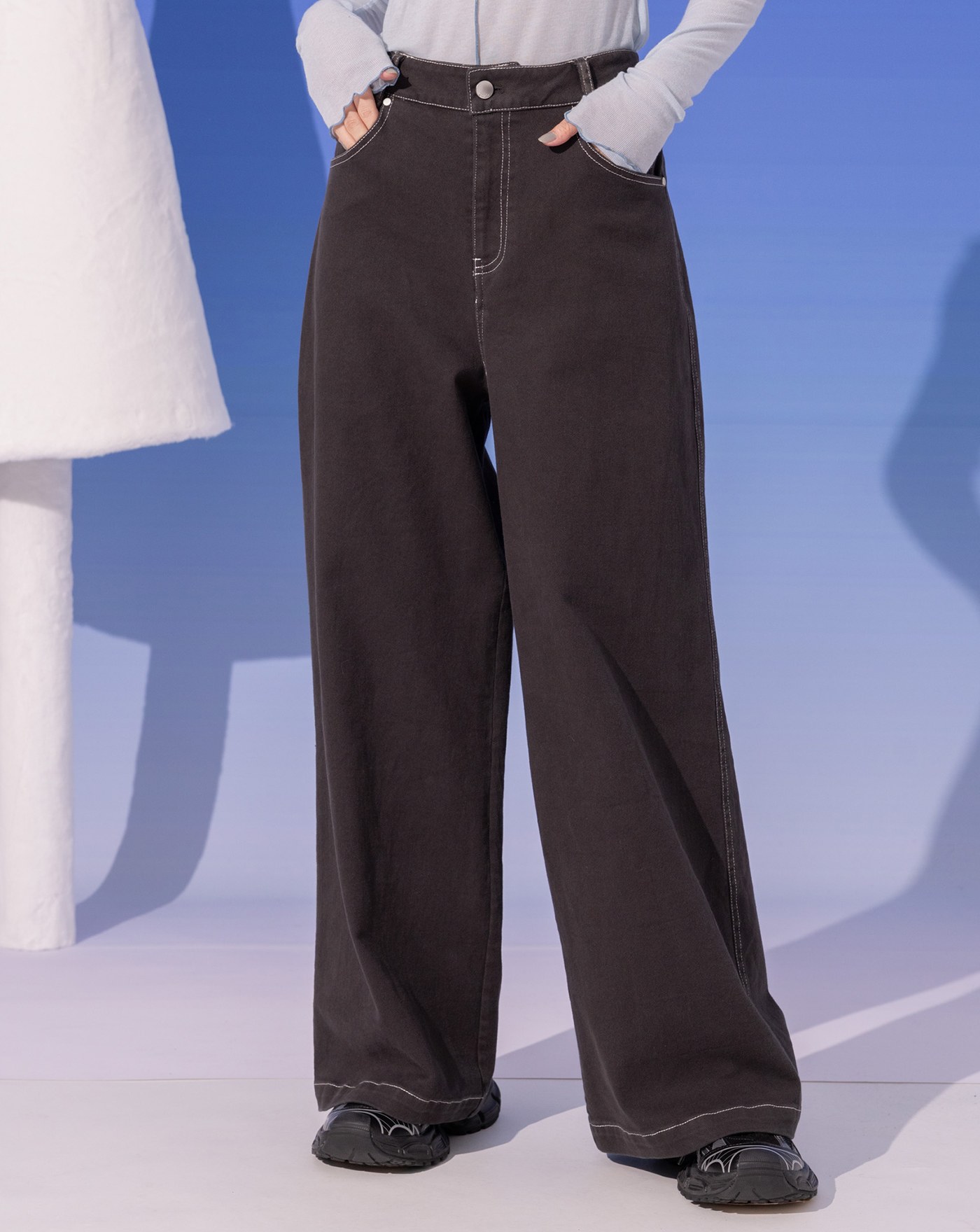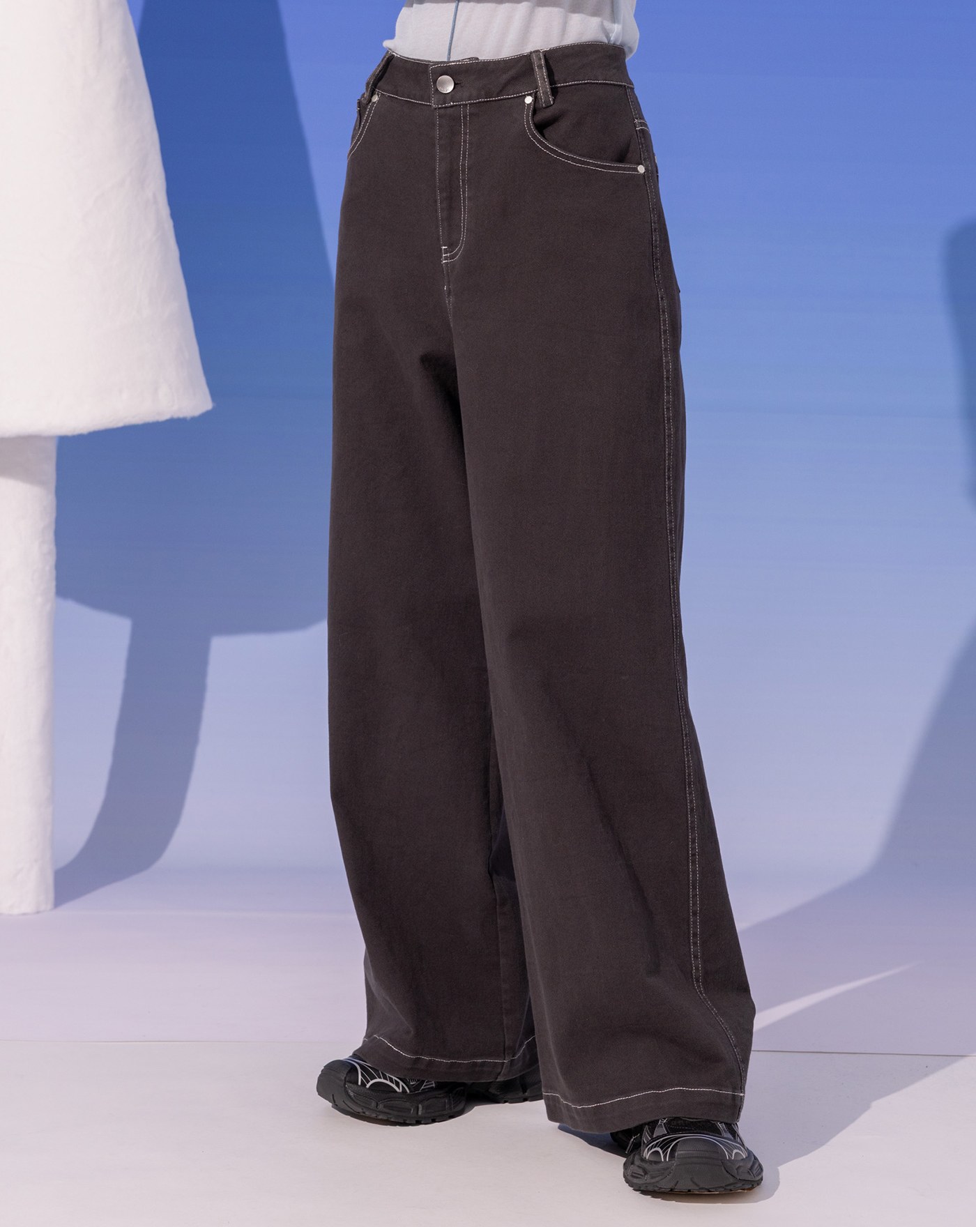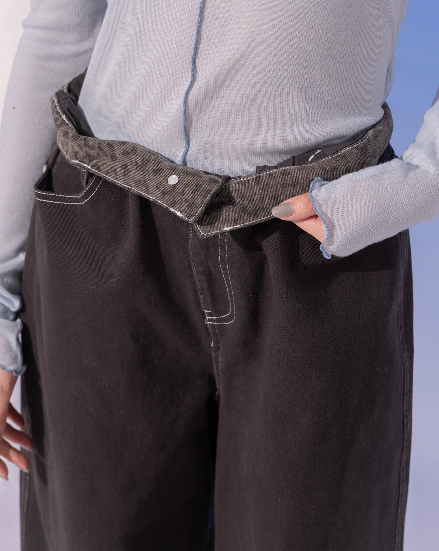 A|大反折品牌標語繡花天絲水洗牛仔寬褲