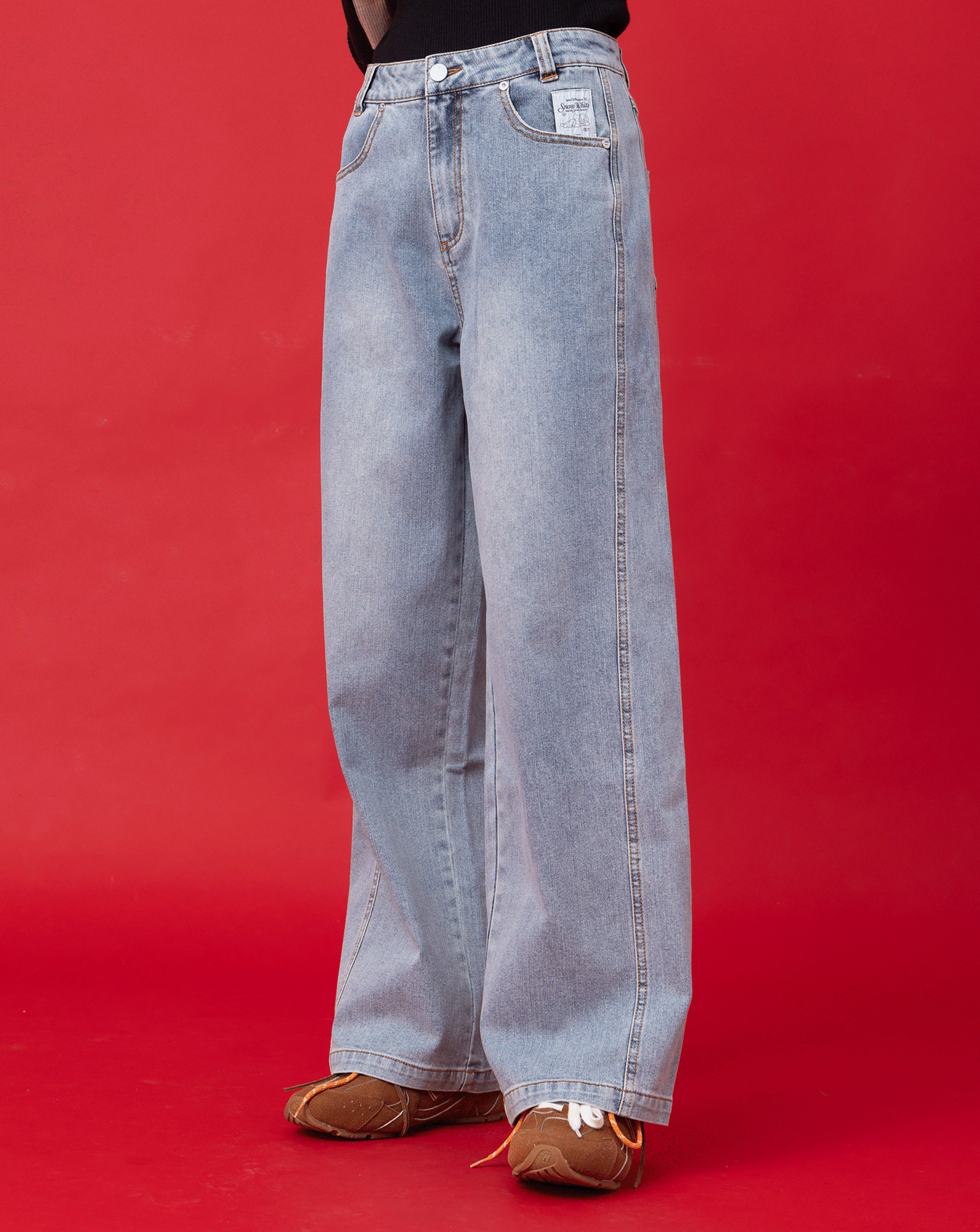 A|異材質拼接立體打褶抽繩牛仔寬褲(兩色)