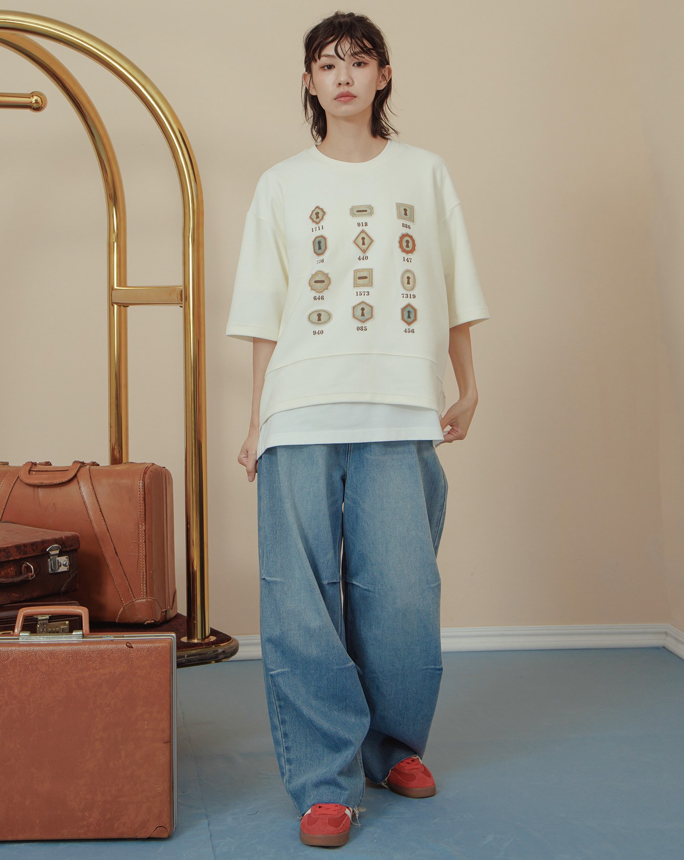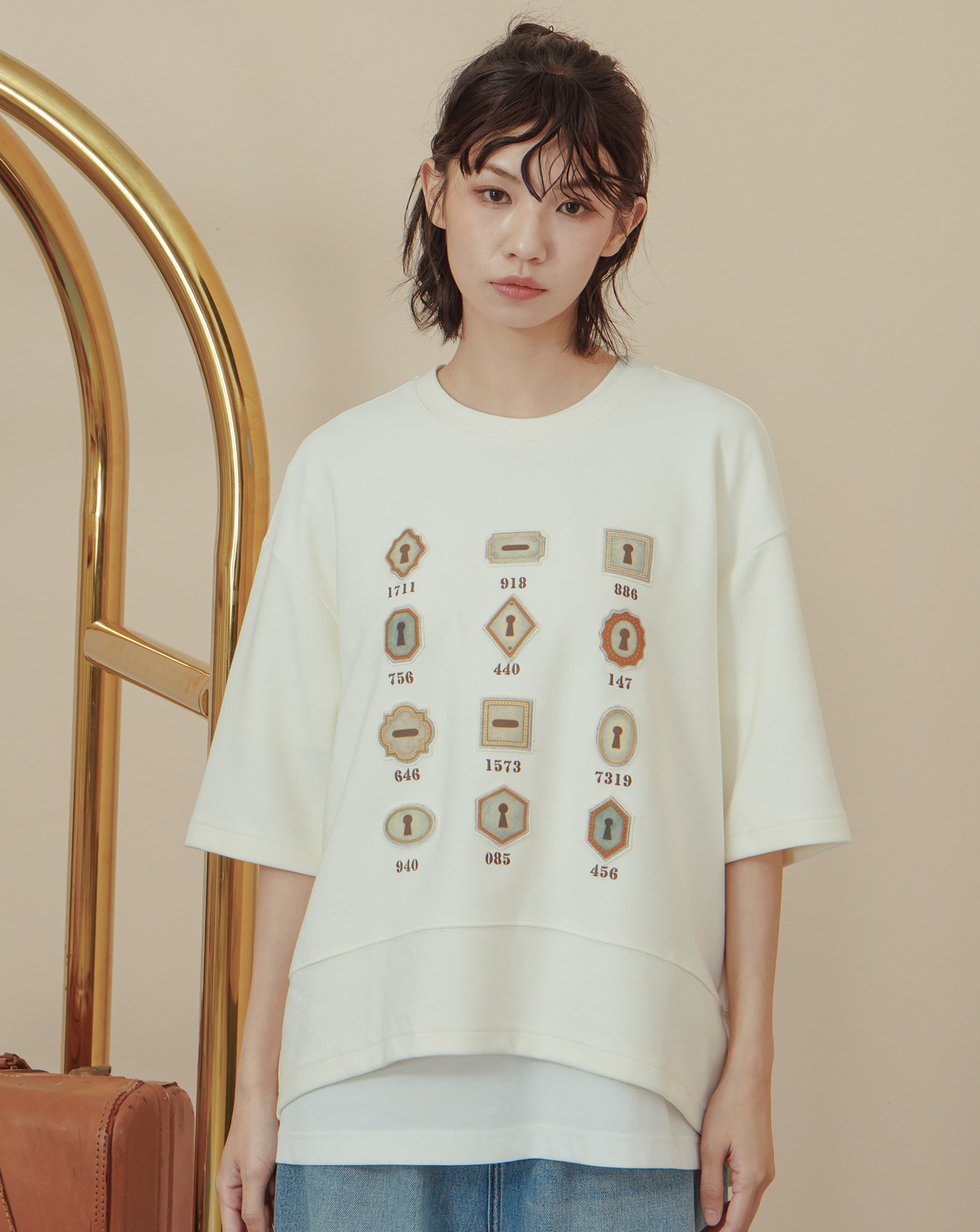 鑰匙圖鑑斑紋印花下擺開衩T恤(兩色)