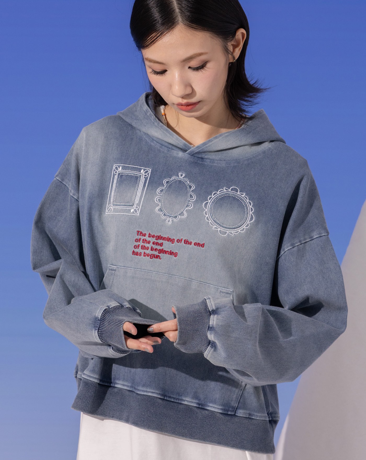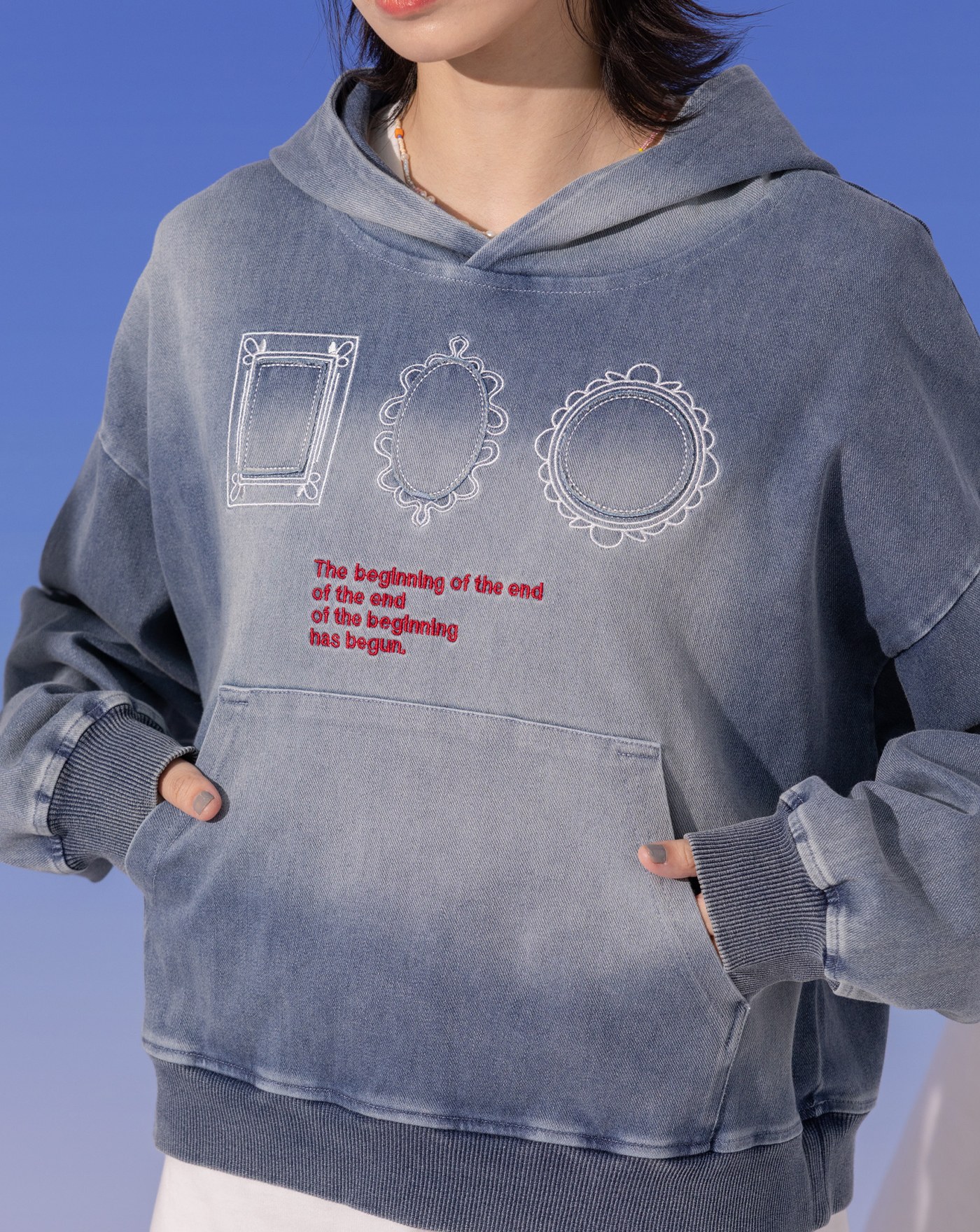 鏡面繡花洗舊感純棉口袋帽T