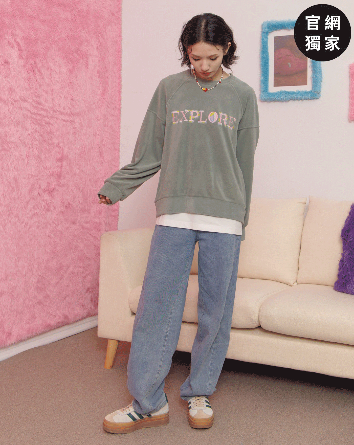 ➤EXPLORE趣味繡花絨毛大學T(四色)